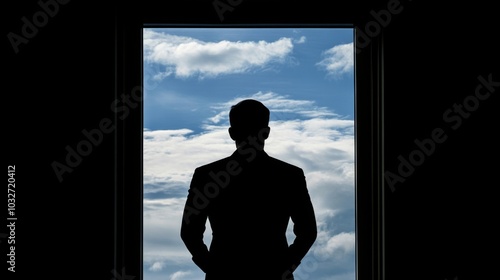 A silhouetted figure stands in a doorway, framed against a bright sky filled with clouds, evoking a sense of contemplation and possibilities.