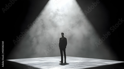 A silhouetted figure stands in a spotlight amidst smoke.