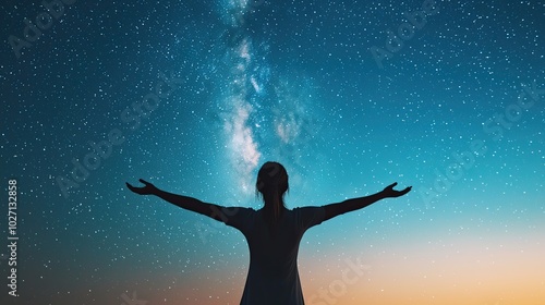 A silhouetted figure stands with arms outstretched under a starry sky, evoking a sense of wonder and connection with the universe.