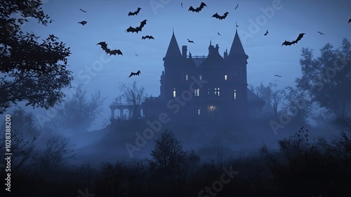 A Silhouetted Gothic Mansion with Bats Flying in a Foggy Twilight Sky