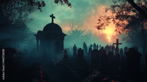A Silhouetted Graveyard at Dusk with a Church and a Foggy Atmosphere