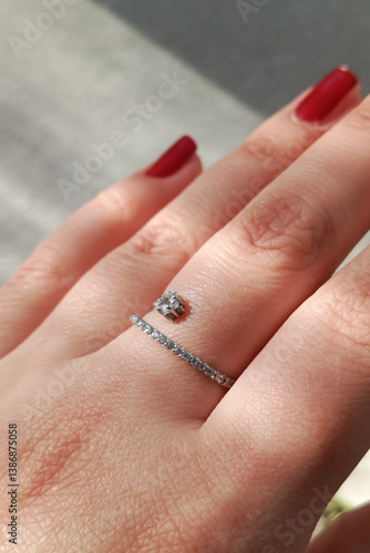 A silver diamond ring on a woman's hand in sunlight on a background of flowers and leaves. Jewelry with precious stones. The engagement.