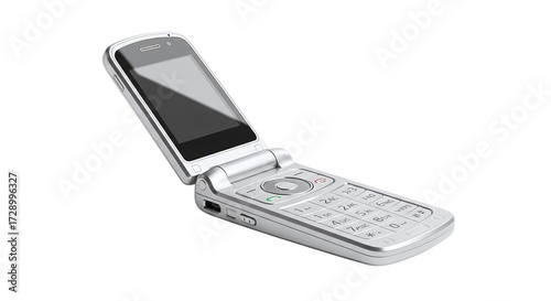 A silver flip phone isolated on transparent background, a classic mobile communication device with a hinged design, blending nostalgia with functionality