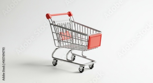 A silver miniature shopping cart with red handles and panels on a white background