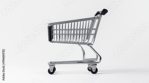 A silver shopping cart featuring a black handle and a black plastic basket set against a white background