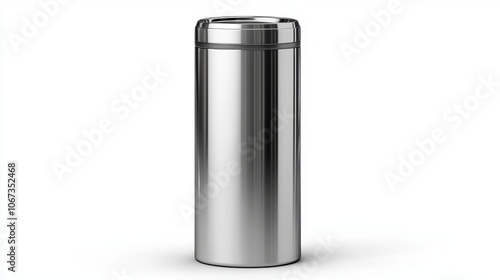 A silver trash can is sitting on a white background