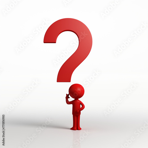 A simple 3D character stands in a thoughtful pose next to a big red question mark, on a white background. Questions, doubts, tasks, hesitations