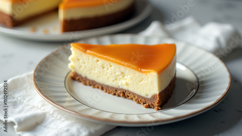 A simple and elegant slice of creamy cheesecake with a smooth, golden glaze on top. The dessert sits on a crisp biscuit base and is served on a white plate placed on a white napkin.