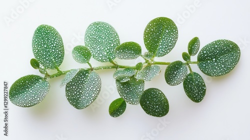 A simple arrangement of several green leaves with droplets of dew, subtly glowing against a bright white background.