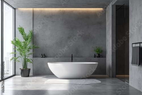 A simple bathroom scene with a white bathtub and a window