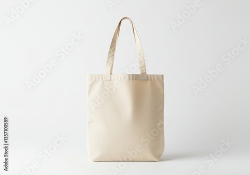 A simple beige tote bag with handles stands centered against a plain white background surface and wall