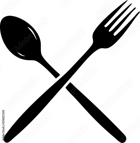 A simple black and white image showing a crossed fork and spoon illustration
