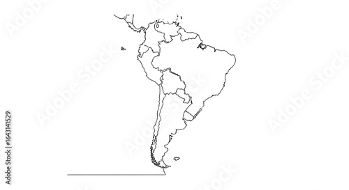 A simple, black and white line drawing of the continent of South America, showing country borders.