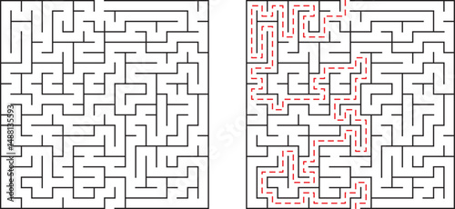 A simple black and white maze puzzle with a red path showing the solution