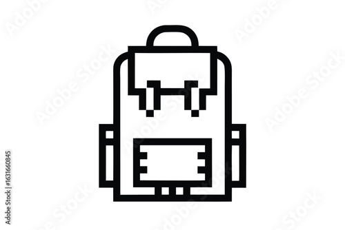 A simple black line art backpack icon sits against a plain white background