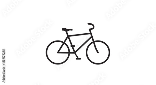 A simple black line drawing of a bicycle with two wheels seat handlebars and frame on a white background