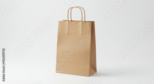 A simple brown paper bag with twisted handles standing on a plain white surface in studio light