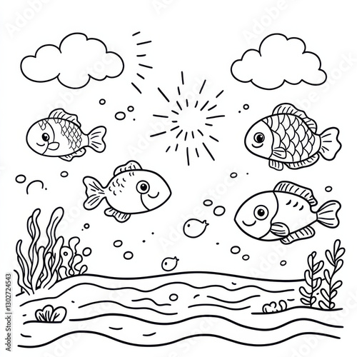 A simple coloring page of an underwater scene with fish swimming in the ocean, sun and clouds above the water surface, simple shapes for kids to color,