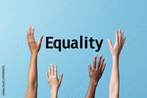A simple design of diverse hands reaching for the word "Equality", representing unity and equal rights in a minimalist style