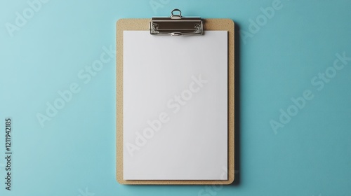 A simple empty clipboard with a clean surface, set against a solid pastel blue background, with soft light casting subtle shadows beneath it