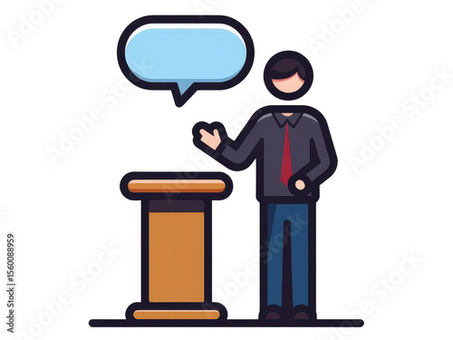 a simple flat 2d icon of 'testimony', with a simple figure icon on a witness stand and a speech bubble coming from them, minimalist design, solid brown and blue colors, clean sharp lines, no shadows