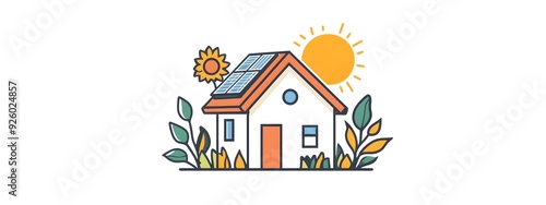 A simple, flat vector logo depicting an off-grid house with solar panels on the roof, a sun in the background, sunflowers, and greenery