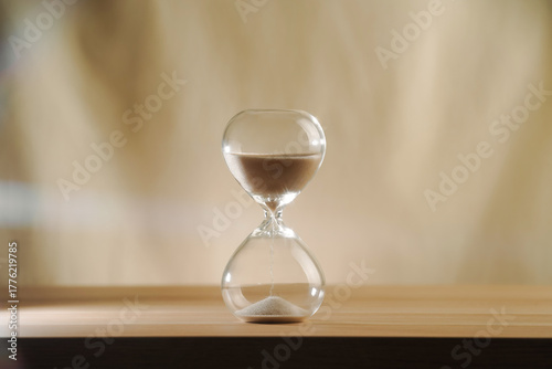 A simple hourglass on a wooden table with a beige backdrop, symbolizing time flow and minimalistic living. Represents timeless themes in a creative, uncluttered presentation for stylish concepts.