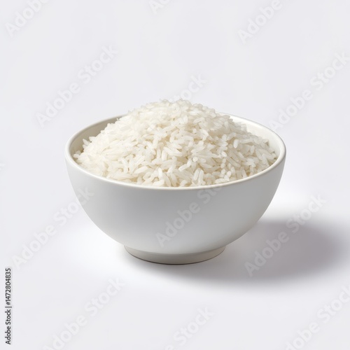 A simple image displaying a bowl filled with fluffy cooked rice on a plain white surface view from side
