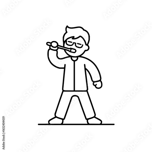 A simple line drawing of a person brushing their teeth while standing on a straight line surface area