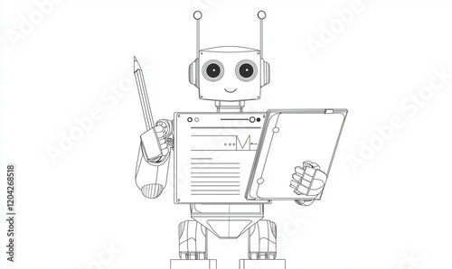 A simple line-art robot holding a document and a pen, illustrating technology and creativity.