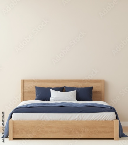 A simple, modern wooden bed with dark blue and white bedding against a light wall, creating a calm and stylish bedroom atmosphere.
