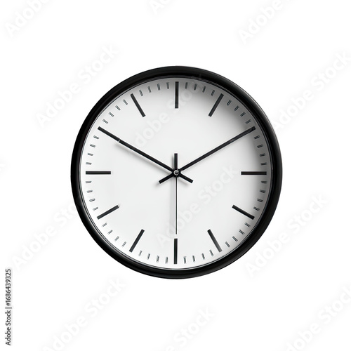 A simple, round clock with a black frame and a white face. Clean, minimalist design