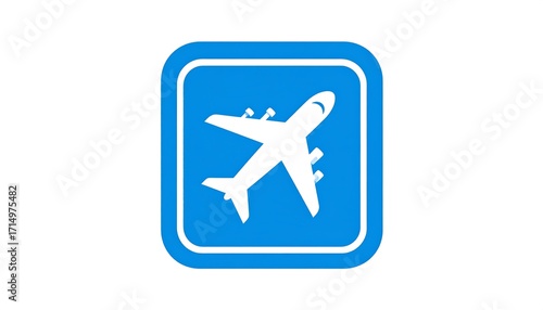 A simple, square-framed graphic depicts a white airplane against a bright blue background.