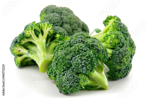 A simple still life image of three pieces of broccoli on a white surface