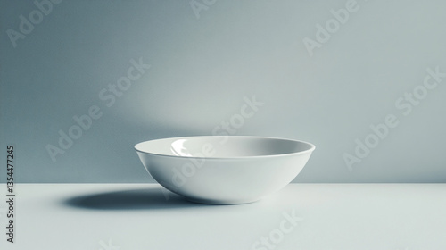 A simple still life of a white ceramic bowl centered on a white surface with a gray background