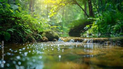 A simple stream in a lush forest, with clear water and vibrant green foliage creating a beautiful and tranquil natural setting.