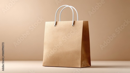 A simple, stylish brown paper bag with white rope handles against a neutral background, ideal for retail or gift purposes.