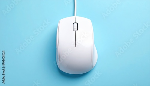A simple, white computer mouse hangs from a cord against a vibrant, light-blue background.