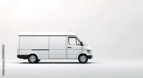 A simple white van with clean-cut body lines, side view showing wheels and windows, minimal antenna, pure-color background