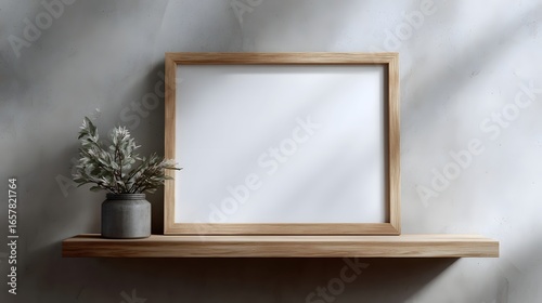 A simple wooden frame on a minimal shelf with a potted plant long title A clean empty wooden frame sits atop a minimalist wooden shelf with soft