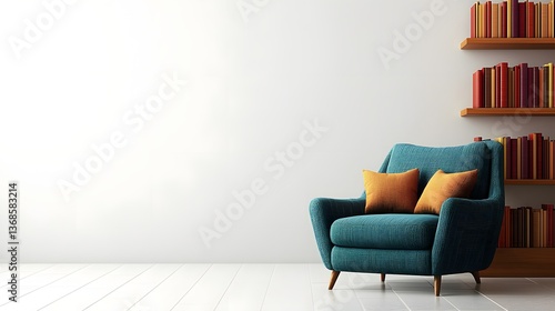 A simple yet elegant chair in a bright room with a bookcase and copy space for a minimalist interior design
