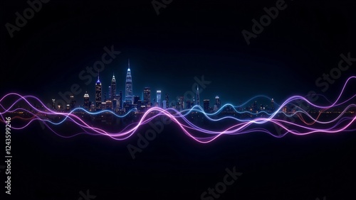 A simplified, geometric city skyline with glowing neon lines in cyan, magenta, or purple against a deep black background