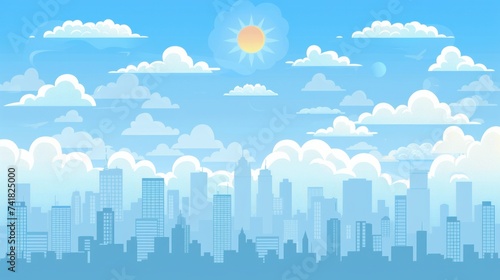 A simplistic yet captivating flat cityscape under a clear blue sky dotted with white clouds