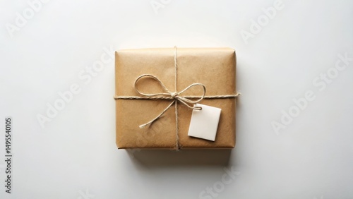 A simply wrapped gift package on a white background, tied with twine and a blank tag