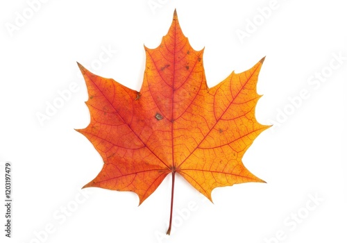 A single autumn maple leaf with vibrant red and orange hues isolated on white background