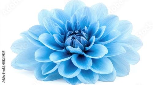 A single blue dahlia flower in full bloom, centered and isolated on a pure white background.