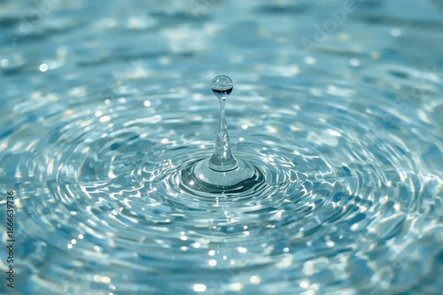 A single blue droplet descends, generating a splash with natural waves and a flawless crown shape.
