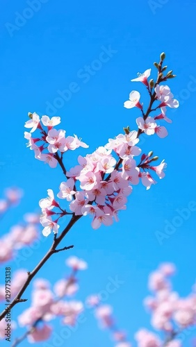 A single branch with delicate pink cherry blossom branches in a clear bright blue sky, pink flowers, trees, blossoming