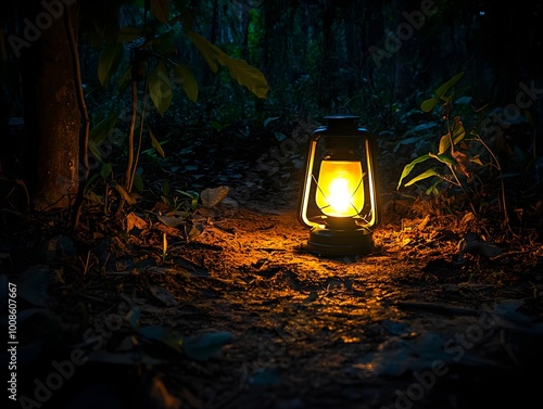 A single bright lantern glowing in the middle of a dark forest, with the soft light illuminating the nearby trees.