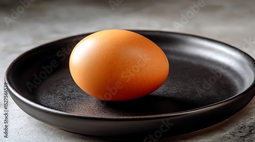 A single brown egg placed on a dark ceramic plate against a neutral background